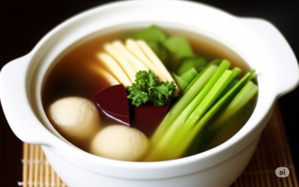 • 取鸡血、4g 蛋皮、4g 青菜烫制 10 秒后放入汤盅, 加入 310g 老鸡汤,葱花点缀出品。